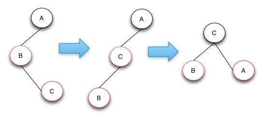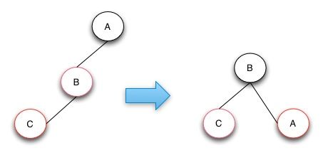 - B和C都是左节点,将B节点进行右旋操作,并且和父节点A互换颜色。通过该修复操作RBTRee的高度和颜色都符合红黑树的定义。