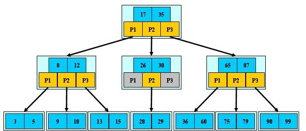 - 非叶子结点的指针:P[1], P[2], …, P[M];其中P[1]指向关键字小于K[1]的子树,P[M]指向关键字大于K[M-1]的子树,其它P[i]指向关键字属于(K[i-1], K[i])的子树;